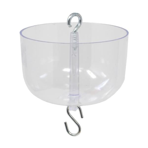 An ant deterrent that holds twice the amount of water as others, meaning it does not have to be refilled as frequently. It's clear, so it doesn't confuse Hummers. You can see when it is empty. Comes with S hook, fits 100% of feeders even decorative feeders. Holds 9 oz