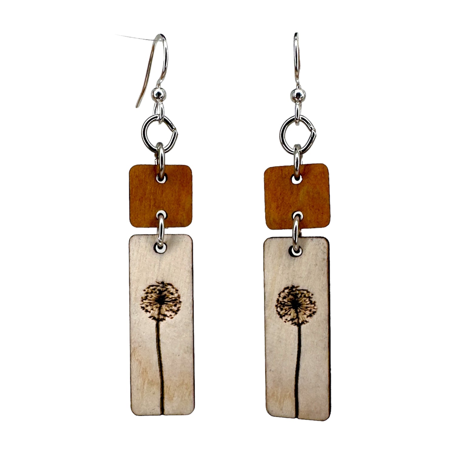 Made from natural wood stained with water-based dye and engraved with a delicate dandy lion bloom. Made from sustainably sourced laser-cut wood on a 90% recycled display card. Ear wires are silver-finished 304L stainless steel, hypoallergenic, and enhanced with a new, smooth and consistent electrophoretic coating that resists tarnishing.
