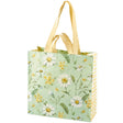 A double-sided market tote from our Garden Collection displaying an all-over design of daisies on a green background. Side gussets display coordinating yellow gingham pattern. Designs are replicated from original art hand painted in a delicate watercolor style. Market tote includes both hand and shoulder straps in yellow nylon and a convenient inside pocket with yellow gingham design. Our Green Daisy market tote is made from eco-friendly post-consumer material and folds flat for easy storage. A charming everyday accessory perfect for shopping or traveling.