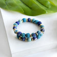 Colorful round Kantha beads in shades of blue and a trio of brass paillette discs are strung on memory wire to form a fabulous wrap bangle. The memory wire makes this bangle-style super easy to get on and off.