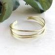 Three rounded, matte metallic bands individually ebb and flow to form this dimensional, fluid cuff. Measures 2.5" in diameter. Adjusts to fit most wrists.