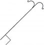 The tall double shepherd staff is made 5/8" Round, Cold Finished steel. This grade of steel has good rigidity and a smooth finished appearance. Each piece is powder coated with an automotive grade black finish that will look good for years. This is a heavy-duty product capable of holding the heaviest bird feeders and heavy hanging baskets. Overall Height: 93". Height of hang point of upper arm when inserted in ground: 72". Reach of arm: 12". Two prongs set 12" into ground